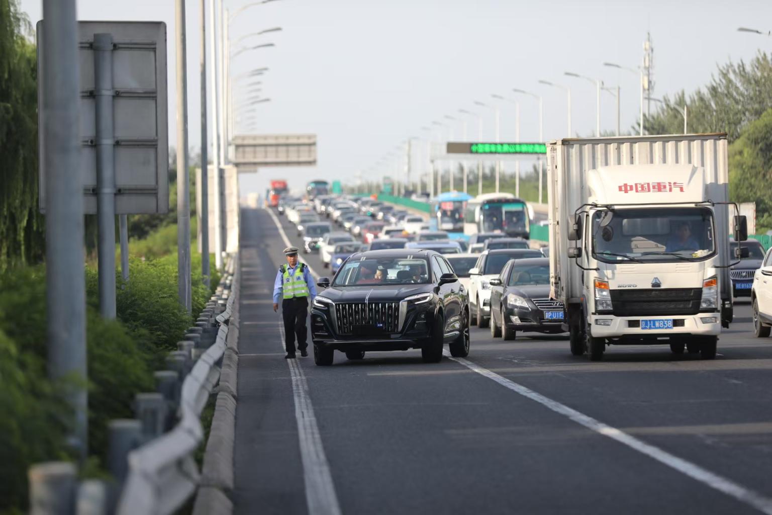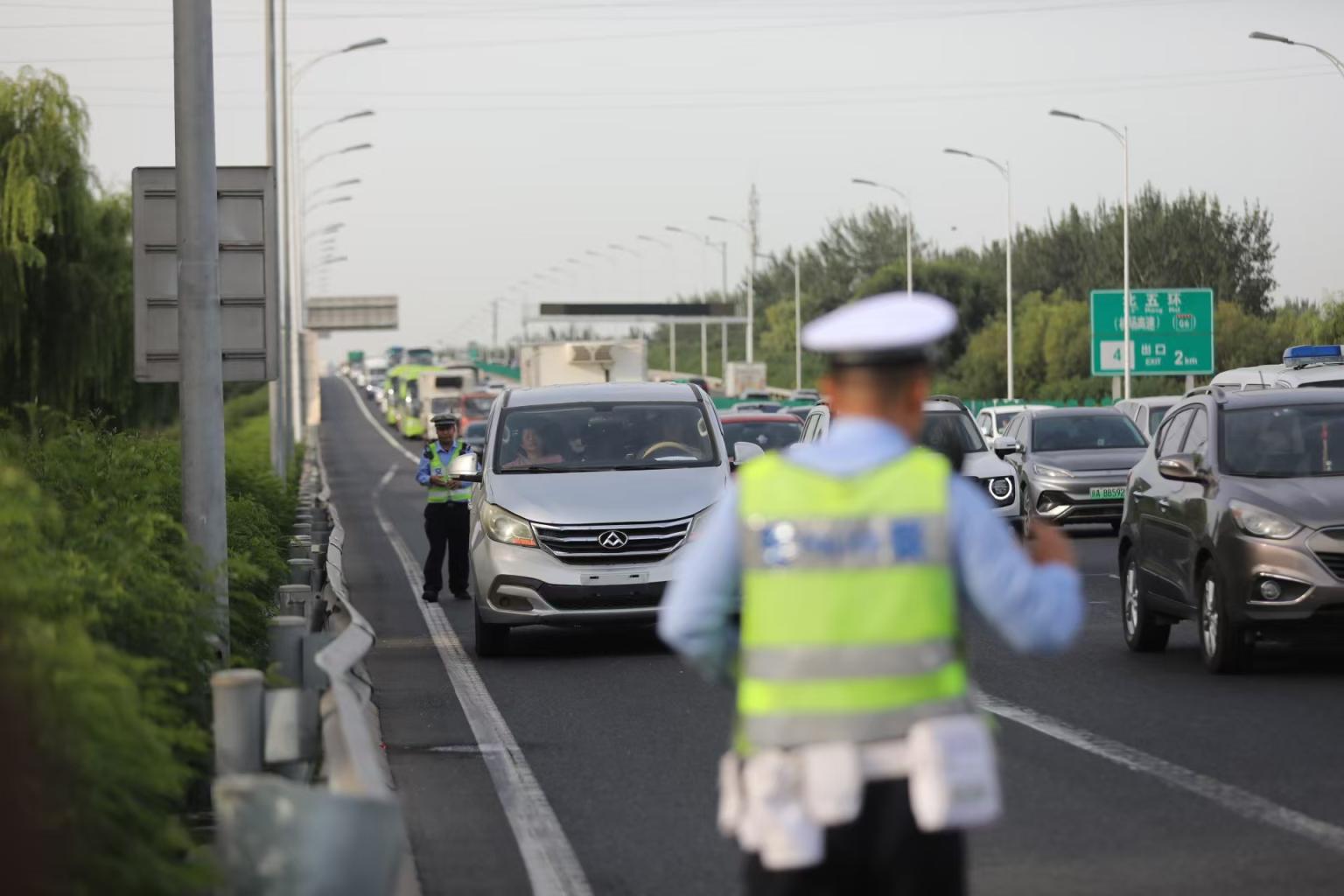 今早7时过后,记者在京承高速来广营桥段看到,出京车流已出现明显缓行排队情况。在京承高速主收费站南侧,有交警在现场维护交通秩序,并对机动车占用应急车道、无牌照行驶等违法行为开展查处。