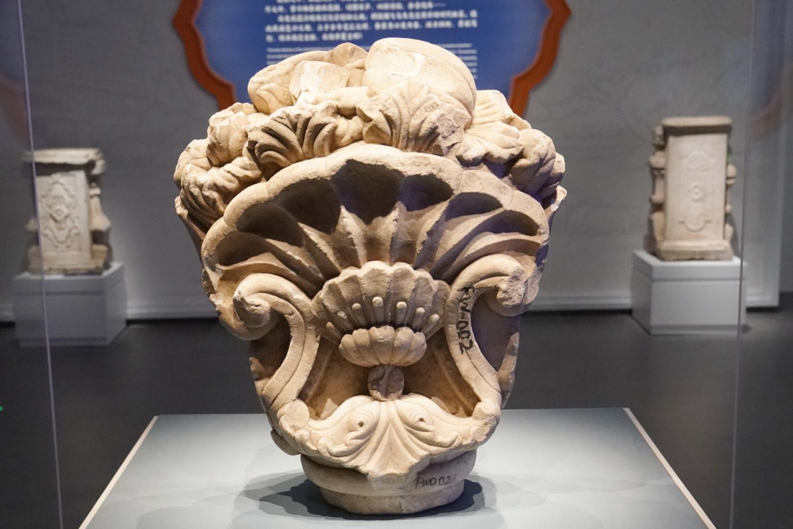 “三山五园”地区的珍贵文物也亮相展厅。一件青花粉彩仙桃蝠耳橄榄瓷瓶,为乾隆时期制瓷工艺的代表,瓶身饰仙桃、蝙蝠纹,取“福寿绵长”“洪福齐天”的吉祥寓意,釉色均匀、纹饰精细,直观展现了清代官窑“工精料美”的特点。雕西洋花建筑构件,出土自圆明园长春园西洋楼遗址,以整块汉白玉雕刻而成,前后刻有大贝壳纹样,顶部雕柿子、莲蓬等吉祥图案,底部饰缠枝花纹,形制为西洋式对称设计,纹饰却融入中国传统吉祥元素,是清代中西方文化交融的直接物证。